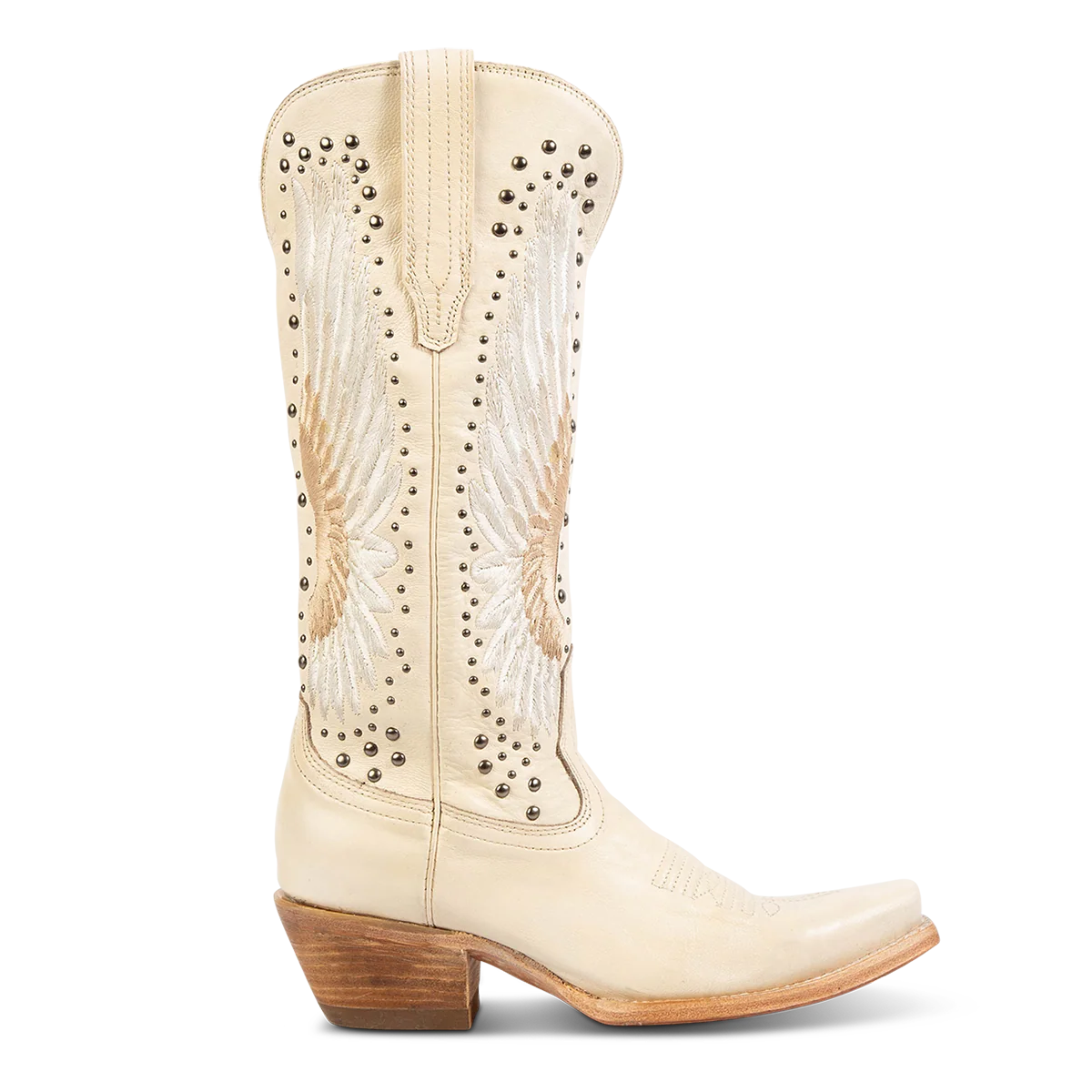 Spread your wings in our favorite western inspired silhouette, introducing ANGEL. Built with a traditional snip toe construction, this boot is paired with symmetrical leather pull straps and a low slant heel. Finished with spirited details that include ombre-stitch wings and embellished studs.