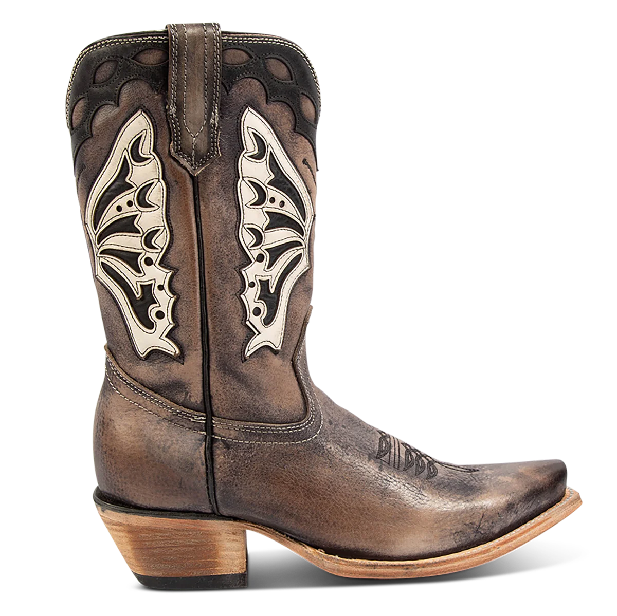 Spread your wings in BUTTERFLY. This western inspired boot combines delicate and feminine stitching with laser cut detailing for the ultimate show-stopping boot. Constructed with a classic snip toe, slant heel and inside working brass zipper for ease of slipping on and off.