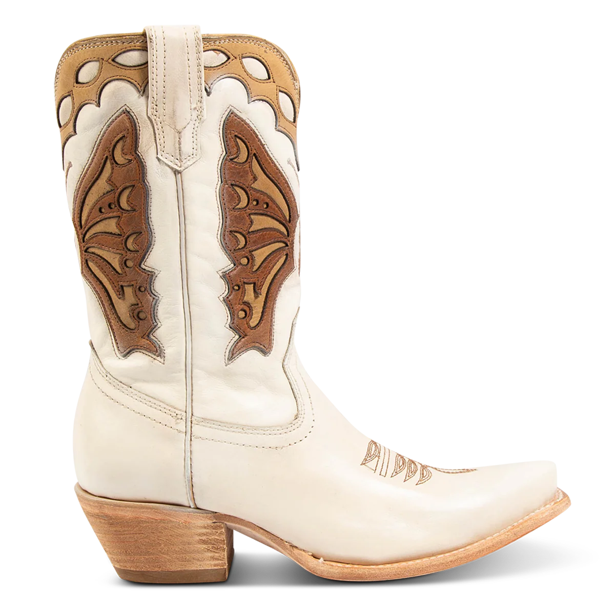 Spread your wings in BUTTERFLY. This western inspired boot combines delicate and feminine stitching with laser cut detailing for the ultimate show-stopping boot. Constructed with a classic snip toe, slant heel and inside working brass zipper for ease of slipping on and off.