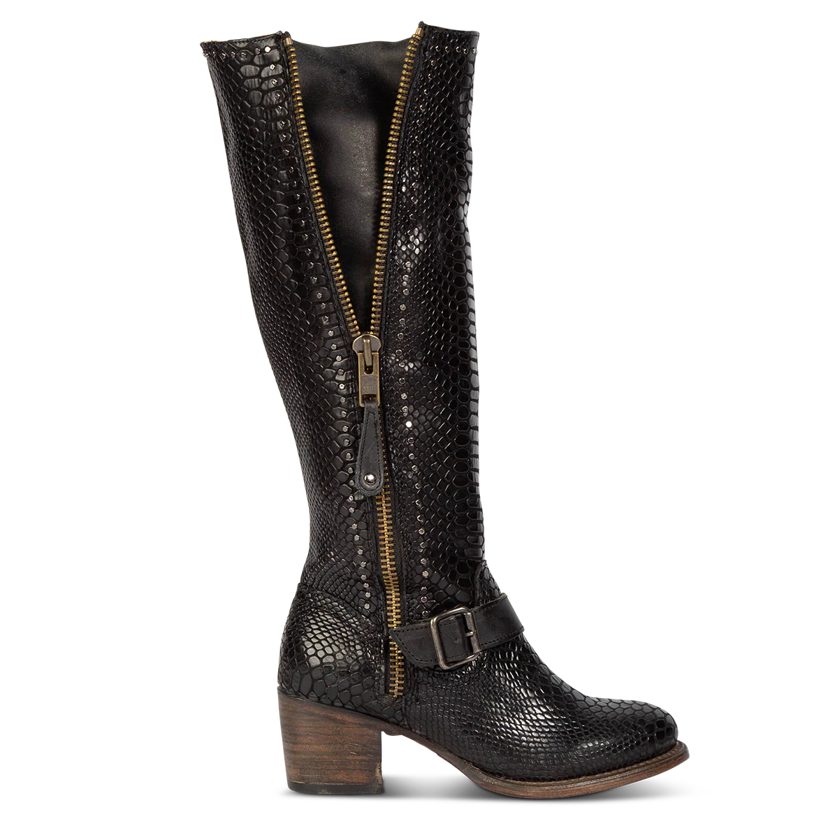 Meet a boot that embodies elegance - CARSON. This leather boot features a stacked wooden heel, stud detailing, and an inside zip closure. Designed with a metal buckle strap and an outside zipper backed by a leather shaft for a customizable fit. Constructed with embossed leather.