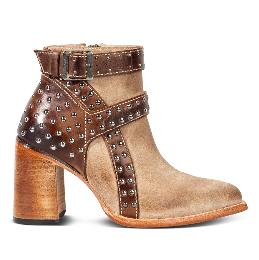 Strike the perfect balance between bold and sophistication with JOVI. This bootie was crafted with a sculpted stacked flare heel, pointed toe, and working brass zip closure. Finished with contrasting 100% full-grain leather trim and stud detailing.