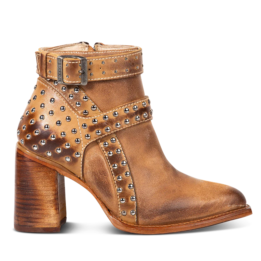 Strike the perfect balance between bold and sophistication with JOVI. This bootie was crafted with a sculpted stacked flare heel, pointed toe, and working brass zip closure. Finished with contrasting 100% full-grain leather trim and stud detailing.