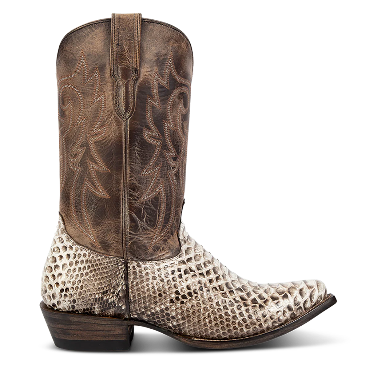 Stirrup your Western collection with MARSHALL. Handcrafted with durable Goodyear welt, 100% full grain leather that shapes with your foot, and detailed with intricate shaft stitching. This made-to-last cowboy boot is constructed with conventional snip toe construction and wrangled together with symmetrical leather pull straps. Designed with genuine python leather.