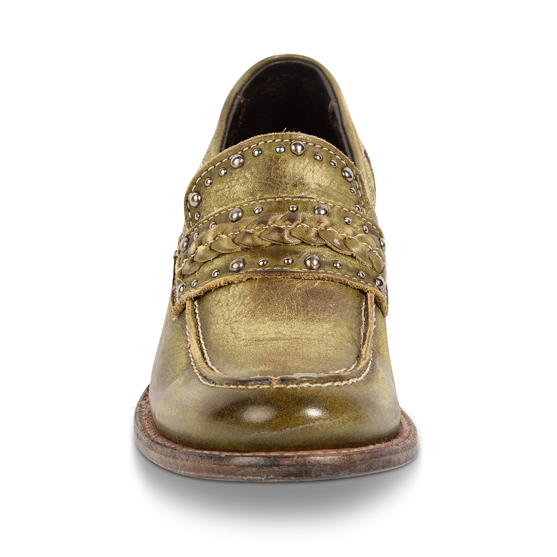 Our modern day loafer with rural roots - meet MYLA. This distinguished oxford silhouette is constructed from 100% full grain leather and subtly adorned with stud detailing and a braided leather band. Finished with a stacked wrap heel and soft leather tongue that provides comfort and flexibility without sacrificing rustic integrity.