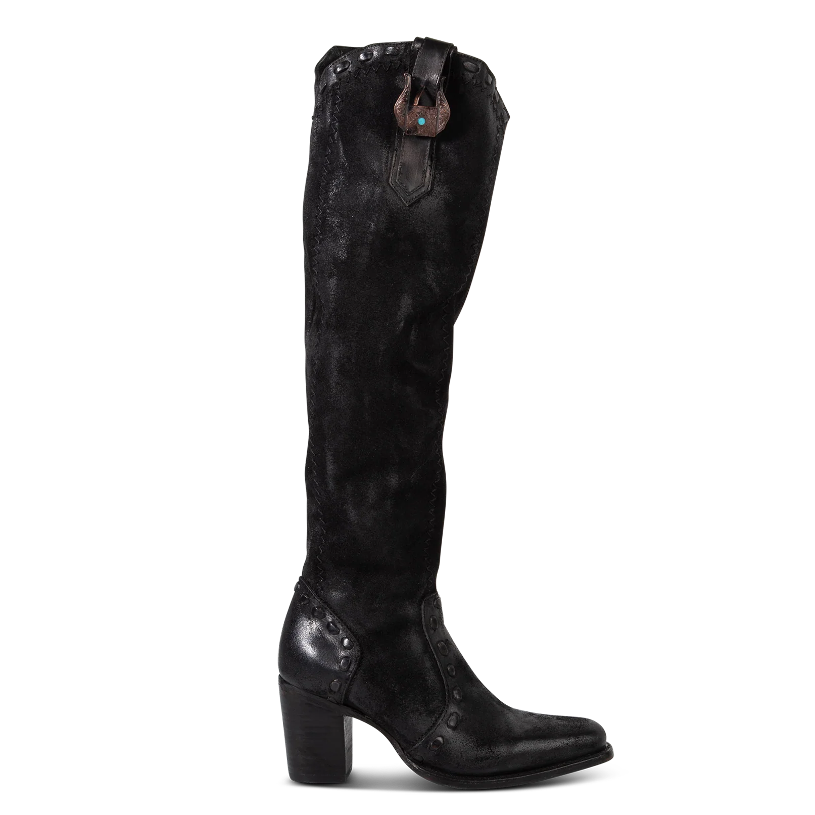 Step into timeless Western elegance with PAISLEY. Designed with soft premium suede with a unique burnished finish, this tall boot delivers an elevated rustic charm that feels both classic and modern. This high frame is outlined with whipstitch detailing, accented leather pull strap, gore construction, and working brass half zip closure.