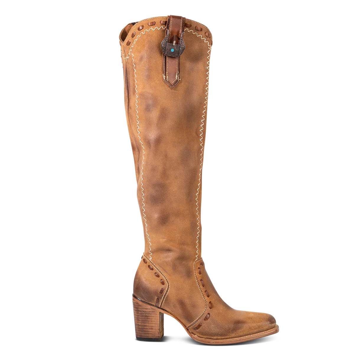 Step into timeless Western elegance with PAISLEY. Designed with soft premium suede with a unique burnished finish, this tall boot delivers an elevated rustic charm that feels both classic and modern. This high frame is outlined with whipstitch detailing, accented leather pull strap, gore construction, and working brass half zip closure.