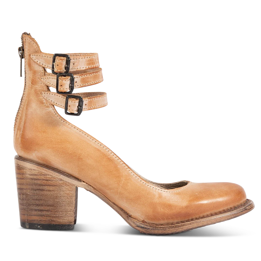 Simple, but never boring - RANDI. Designed with an open construction, this mid-heel shoe creates a clean feminine silhouette with its leather ankle straps and round toe. Finished with metal adjustable buckles and a back zip closure.