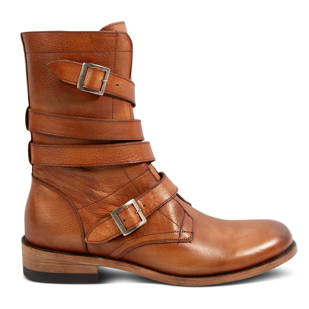 RUMBLE is handcrafted with a slim fit configuration made from 100% full grain leather and built on a stacked heel for a rugged look. This urban-inspired boot features adjustable leather shaft straps for fit customization and an inside working brass zipper for ease of comfort . Finished with a rounded toe, leather sole and Goodyear welt.