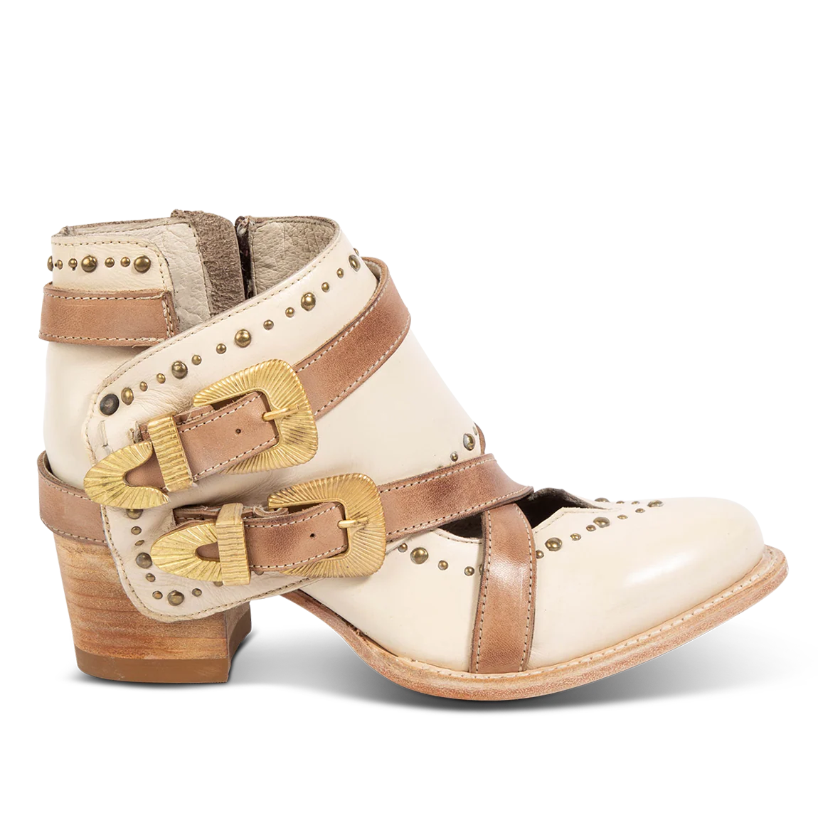 SAMANTHA walks the line between bold and refined. Crafted from 100% full-grain leather, this western bootie stands out with its double gold-tone buckles, rich contrasting strap detailing, and antique brass studs. A cutout silhouette offers a touch of daring edge, while a stacked heel and pointed almond toe bring timeless elegance.