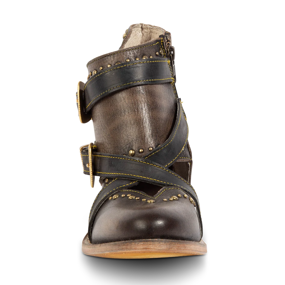 SAMANTHA walks the line between bold and refined. Crafted from 100% full-grain leather, this western bootie stands out with its double gold-tone buckles, rich contrasting strap detailing, and antique brass studs. A cutout silhouette offers a touch of daring edge, while a stacked heel and pointed almond toe bring timeless elegance.