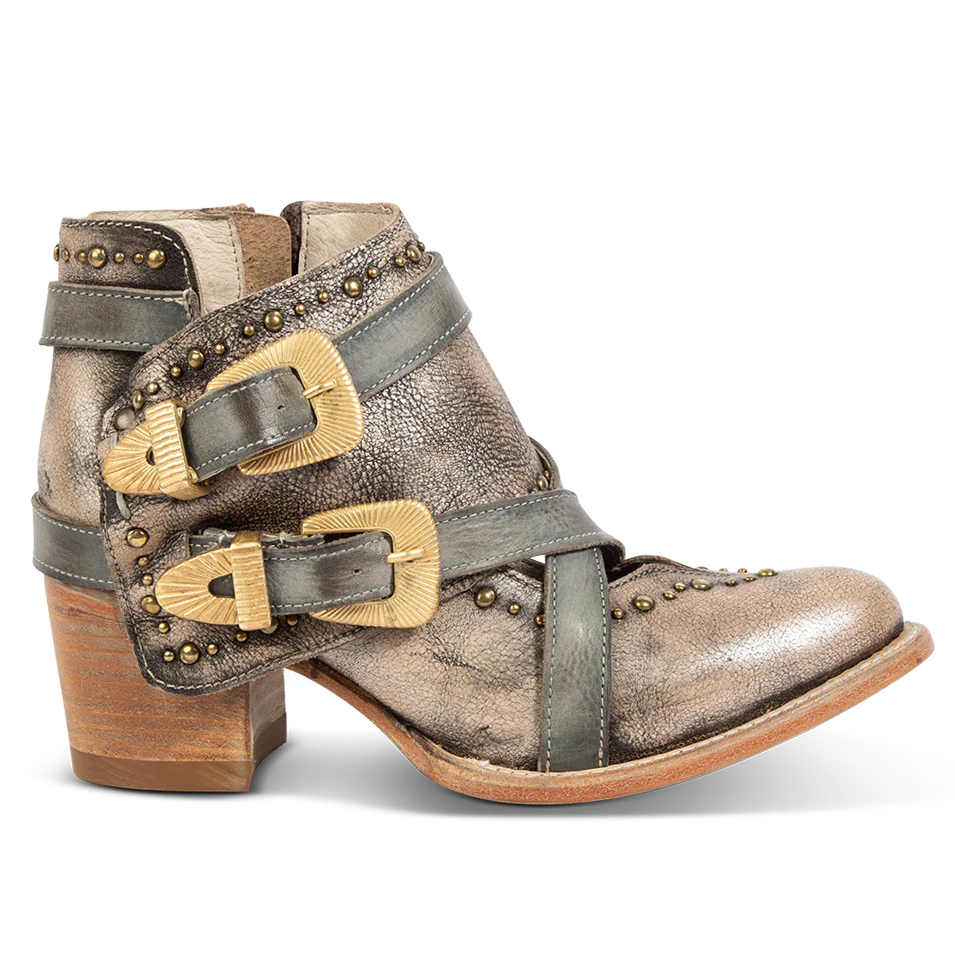 SAMANTHA walks the line between bold and refined. Crafted from 100% full-grain leather, this western bootie stands out with its double gold-tone buckles, rich contrasting strap detailing, and antique brass studs. A cutout silhouette offers a touch of daring edge, while a stacked heel and pointed almond toe bring timeless elegance.