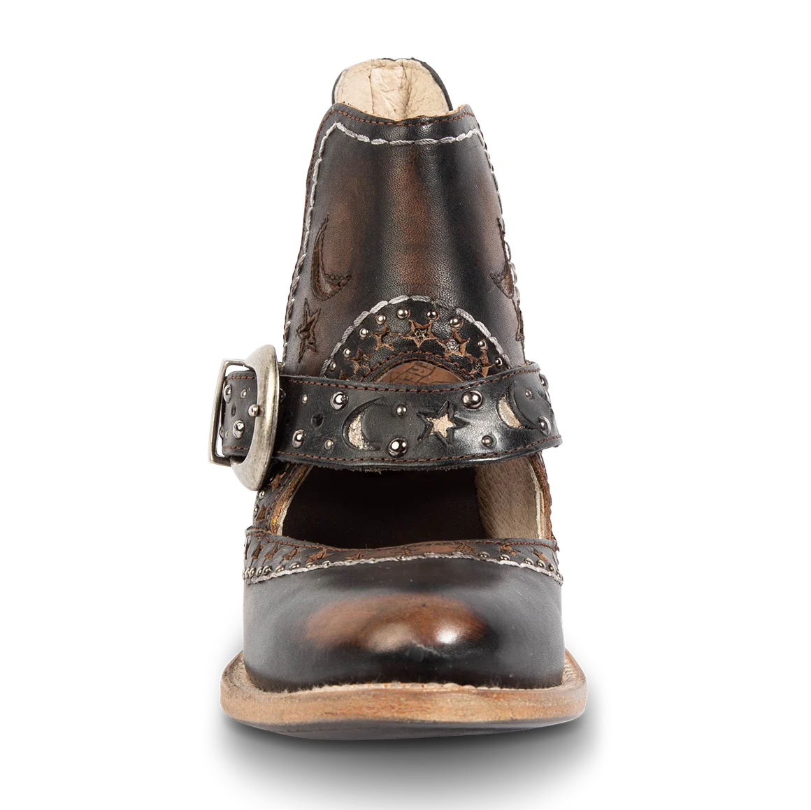 Step into the spotlight with STARDOM, a bootie that's written in the stars. This leather beauty radiates Western charm with laser-cut celestial cutouts, metal stud accents, and open foot detailing. Balanced with a buckled strap and stacked heel, adding both edge or function to its silhouette.