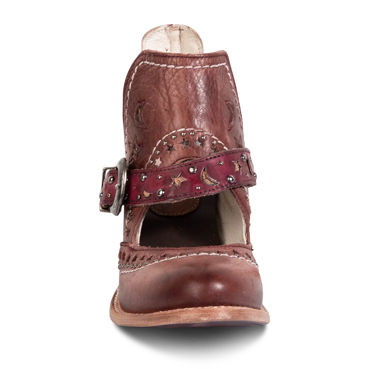 Step into the spotlight with STARDOM, a bootie that's written in the stars. This leather beauty radiates Western charm with laser-cut celestial cutouts, metal stud accents, and open foot detailing. Balanced with a buckled strap and stacked heel, adding both edge or function to its silhouette.