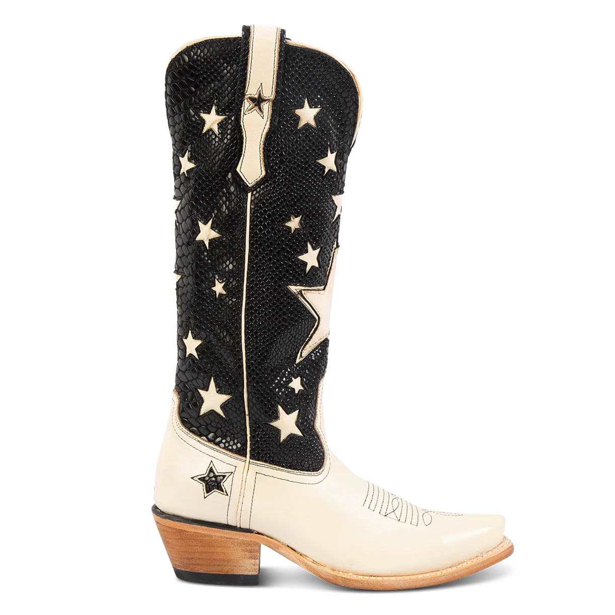 Displaying a smooth and embossed leather shaft with intricate inlay detailing, this western silhouette will have you reaching for the STARZZ. Constructed with a snip toe, traditional stitching, and completed with exterior pull straps.