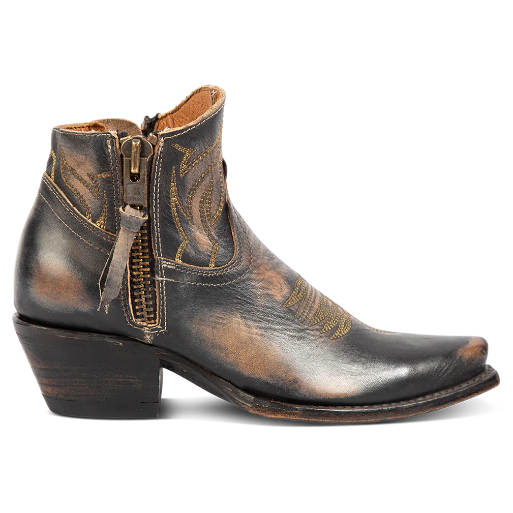 WOLFIE - a western silhouette that looks perfectly worn. Notice the scuffs and marks on your new boots? This bootie features intentional distressing through our rock tumbling process that gives them a unique character. Every pair comes with its own one-of-a-kind finish that is no accident. Completed with a snip toe, intricate stitch detailing, a low slanted heel and symmetrical brass zip closure.