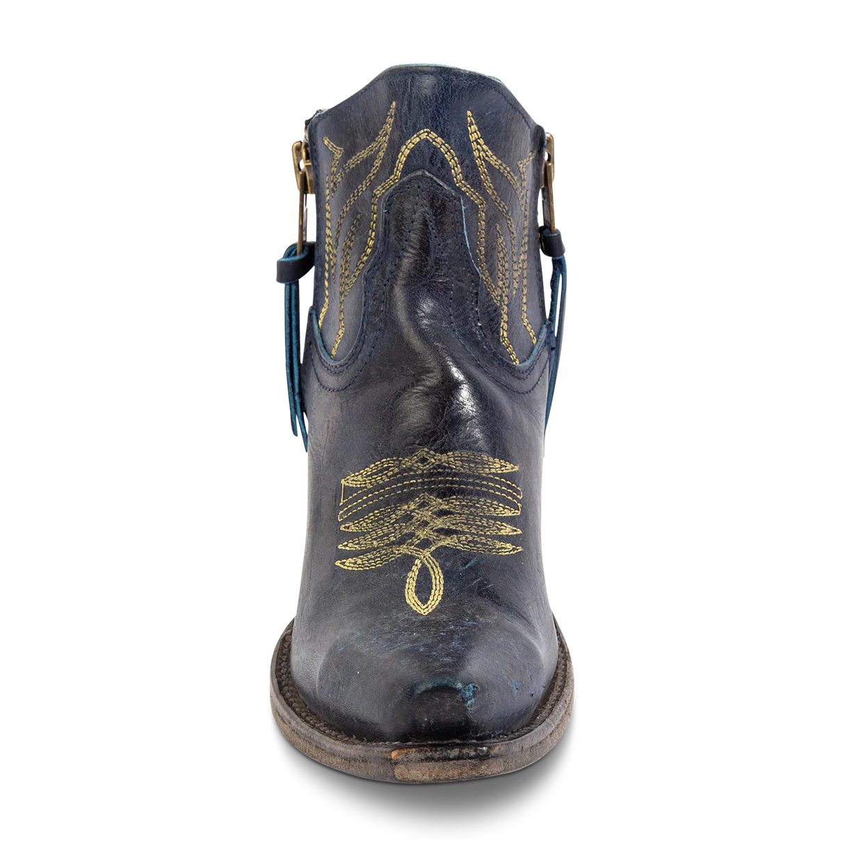 WOLFIE - a western silhouette that looks perfectly worn. Notice the scuffs and marks on your new boots? This bootie features intentional distressing through our rock tumbling process that gives them a unique character. Every pair comes with its own one-of-a-kind finish that is no accident. Completed with a snip toe, intricate stitch detailing, a low slanted heel and symmetrical brass zip closure.